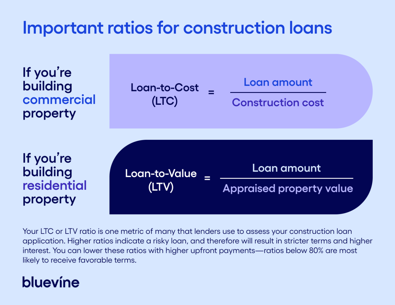 Construction loans tend to come from smaller institutions like regional banks and credit unions. Always choose an experienced lender and compare interest rates and loan terms based on your project’s scope and expected cost. You should also calculate your Loan-to-Cost (LTC) and Loan-to-Value (LTV) ratios, as these will affect your terms and payments: